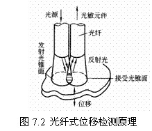 (2)光纖式位移檢測傳感器:圖7.2是一種光纖端光量位移傳感器的原理,由光源發(fā)出經發(fā)射光纖的光在被測物體表面反射,并由接收光纖傳回到光敏元件。光敏元件的輸出信號的大小與物體的位移有關。隨位移的增大其輸出特性可分為前坡區(qū)、光峰區(qū)和后坡區(qū)。利用這三個區(qū)可分別進行微位移、表面狀況和較大位移的粗略測量。