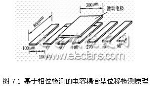 (1)電容式位移傳感器:電容式位移傳感器有改變電極工作面積和變極間距離兩種類型。圖7.1為基于相位檢測的電容耦合型位移傳感器的工作原理圖?;瑒与姌O與固定電極間的耦合電容隨滑動電極的位置變化而改變,在固定電極上施加相位相差90°的正弦波電壓,則在滑動電極上產生的感應電勢的相位是固定電極排列方向上位移的函數(shù)。