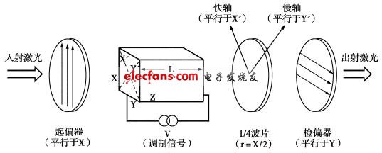 激光器可以是氣體激光器,也可以是半導(dǎo)體激光器,根據(jù)不同形式激光器工作物質(zhì)的不同,所發(fā)射激光的波長(zhǎng)也有差異,對(duì)應(yīng)632.8nm、670nm、820nm以及850nm不等,須選擇與之相匹配的激光膠片才能獲得優(yōu)良的影像和穩(wěn)定的效果。這種結(jié)構(gòu)巧妙地采用了多邊形平面反射鏡和廣角發(fā)散透鏡構(gòu)成光束偏轉(zhuǎn)掃描器,高速旋轉(zhuǎn)的多邊形平面反射鏡能將入射的固定激光束轉(zhuǎn)變成快速地、反復(fù)從左至右移動(dòng)的掃描光束,廣角發(fā)散透鏡可使得在較短的空間距離內(nèi)獲得較大的偏轉(zhuǎn)角度。電光學(xué)調(diào)制器的調(diào)制原理如圖8-8,它主要由雙折射壓電晶體和一對(duì)置于兩側(cè)的偏轉(zhuǎn)器組成。兩偏轉(zhuǎn)器相對(duì)于電感應(yīng)雙折射晶體主軸X′和Y′成450角。由1/4波片引起固定的相位延遲,因此總相位延遲等于該晶體引入的固定相位延遲與電感應(yīng)產(chǎn)生的相位延遲之和。在晶體入射平面上,入射光束平行于X軸,故在X′和Y′方向有相等且同相位的分量,但當(dāng)光從出射面Z=L射出時(shí),X′和Y′分量間有了相對(duì)的相位差(延遲)。其結(jié)果,從輸出偏振器(檢偏器)射出的激光強(qiáng)度與原入射激光強(qiáng)度之比受外加調(diào)制信號(hào)的變化而變化,達(dá)到了線性調(diào)制的目的。
