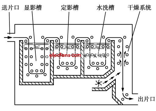 (1)自動(dòng)輸送系統(tǒng) 用以控制速度、膠片沖洗順序、顯影及定影時(shí)間。該系統(tǒng)分為外部傳送和機(jī)內(nèi)傳送兩部分。半明室式自動(dòng)沖片機(jī)的外部傳送,由一個(gè)金屬或塑料托盤(pán)構(gòu)成。明室式自動(dòng)沖片機(jī)的外部傳送部分與相應(yīng)的供片暗盒相配套,通過(guò)負(fù)壓吸盤(pán)使膠片安全迅速地送入機(jī)內(nèi)傳送系統(tǒng)。機(jī)內(nèi)傳送系統(tǒng)為輥筒式,由許多耐腐蝕橡膠輥輪、塑料或不銹鋼齒輪連成一體。輥輪在各程序中配用的大小、形狀有所不同,工作時(shí)不停地轉(zhuǎn)動(dòng)。輸送系統(tǒng)為自動(dòng)控制。