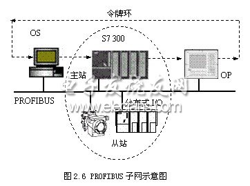 PROFIBUS是用于現(xiàn)場級或控制單元級的開放式、標準化高速現(xiàn)場總線,如圖2.6,其總線存取協(xié)議是結(jié)合了令牌環(huán)和主從方式的混合介質(zhì)存取技術(shù),是一種倍受青睞的組網(wǎng)方式,傳輸速率可達12Mbps,通常使用的傳輸介質(zhì)是屏蔽雙芯電纜或者是光纜,每一個網(wǎng)段最多可以掛接126個站點設(shè)備。