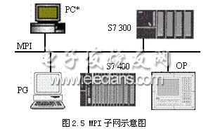 MPI子網(wǎng)是一種低成本的網(wǎng)絡(luò)系統(tǒng),其物理層符合RS485標準,具有多點通信的性質(zhì)。如圖2.5,由于所有S7-300/S7-400的CPU單元上都集成了MPI接口,用戶可以很方便地用MPI接口把多個PLC、PC、OP等控制設(shè)備直接組成MPI網(wǎng)。接入到MPI網(wǎng)的設(shè)備稱為一個站點,一個MPI網(wǎng)最多允許連接32個站點,傳輸速率為187.5Kbps,不加中繼時的最大總線長度僅為50m。因此,MPI子網(wǎng)主要適用于站點數(shù)不多、數(shù)據(jù)傳輸量不大的應(yīng)用場合。