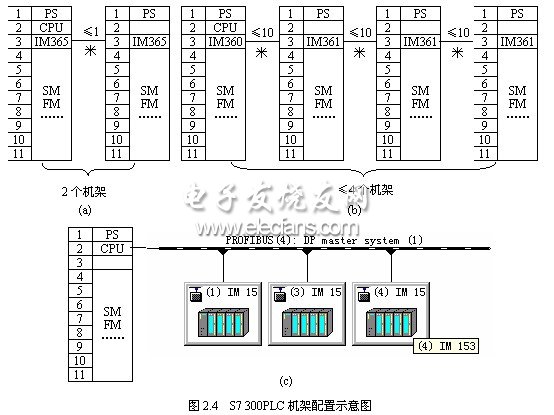 圖2.4(a)、(b)為集中安裝模式,最多可安裝的機架數(shù)量以及機架之間的距離都有明確的規(guī)定。圖2.4(c)為分布式I/O模式,它借助Profibus-DP現(xiàn)場總線來連接安裝于現(xiàn)場的各遠程I/O機架(RIOU),總線長度與通信速率有關(guān),機架之間的距離沒有規(guī)定,總線上最多可以安裝的機架數(shù)量也沒有規(guī)定,但最多可以配置的I/O模塊取決于CPU的尋址能力。當機架數(shù)量較少的時候可以采用前兩種模式,如果機架數(shù)量較多或者機架之間的距離較長的時候,則采用分布式I/O模式。