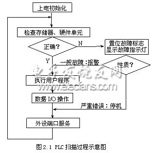 PLC的CPU采用分時操作的原理,其工作方式是一個不斷循環(huán)的順序掃描過程,從用戶程序的第一條指令開始順序逐條地執(zhí)行,直到用戶程序結(jié)束,然后開始新一輪的掃描。如圖2.1,PLC的整個掃描過程可以概括地歸納為上電初始化、一般處理掃描、數(shù)據(jù)I/O操作、用戶程序的掃描、外設(shè)端口服務(wù)五個階段。每一次掃描所用的時間稱為一個工作周期或掃描周期,PLC的掃描周期與PLC的硬件特性和用戶程序的長短有關(guān),典型值一般為幾十ms。