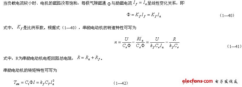 串勵(lì)電動(dòng)機(jī)的勵(lì)磁繞組與電樞繞組相串聯(lián),電樞電流即為勵(lì)磁電流。串勵(lì)電動(dòng)機(jī)的工作特性與并勵(lì)電動(dòng)機(jī)有很大的區(qū)別。當(dāng)負(fù)載電流較小時(shí),磁路不飽和,主磁通與勵(lì)磁電流(負(fù)載電流)按線性關(guān)系變化,而當(dāng)負(fù)載電流較大時(shí),磁路趨于飽和主磁通基本不隨電樞電流變化。因此討論串勵(lì)電動(dòng)機(jī)的轉(zhuǎn)速特性、轉(zhuǎn)矩特性和機(jī)械特性必須分段討論。