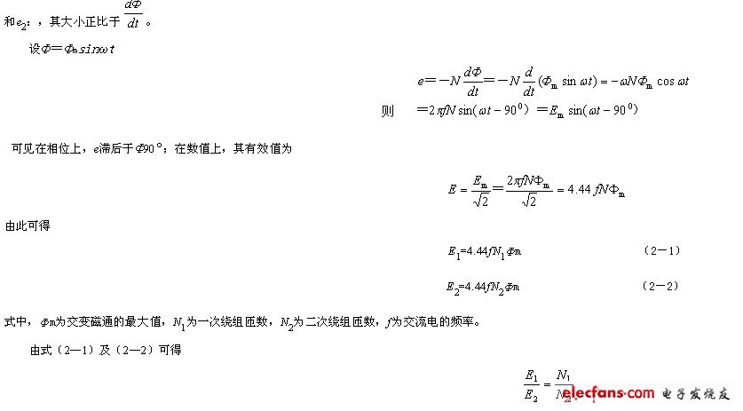 由式(2—5)可見:變壓器一、二次繞組的電壓與一、二次繞組的匝數(shù)成正比,也即變壓器有變換電壓的作用。