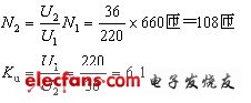 例2—2:如圖2—11所示,低壓照明變壓器一次繞組匝數(shù)N1=660匝,一次繞組電壓Ul=220V,現(xiàn)要求二次繞組輸出電壓U2=36V,求二次繞組匝數(shù)N2及變比Ku