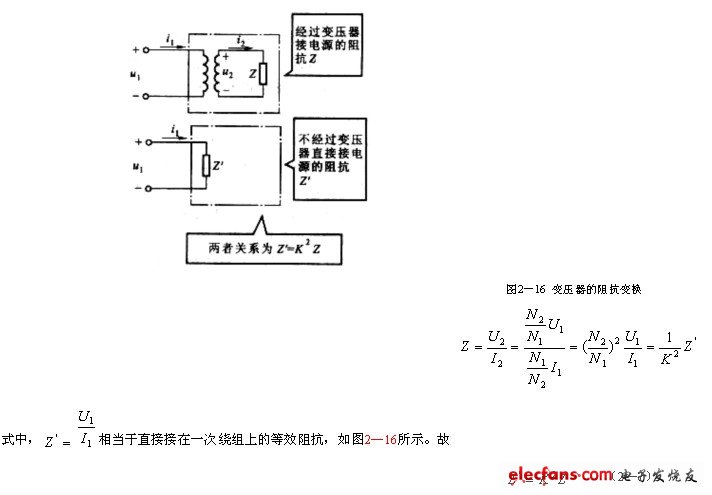 變壓器不但具有電壓變換和電流變換的作用,還具有阻抗變換的作用,如圖2—16所示,當(dāng)變壓器二次繞組接上阻抗為Z的負(fù)載后,則