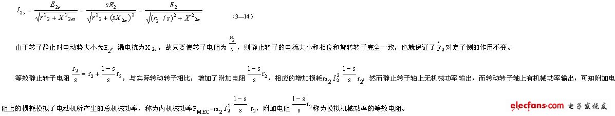 這樣輸入給轉(zhuǎn)子的電磁功率Pem僅須扣除轉(zhuǎn)子銅耗PCu2,便是產(chǎn)生于電機(jī)轉(zhuǎn)軸上帶動(dòng)轉(zhuǎn)子旋轉(zhuǎn)的總機(jī)械功率PMEC,也就等于等效電阻