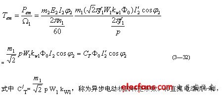 從上式看出,異步電動(dòng)機(jī)電磁轉(zhuǎn)矩與氣隙每極磁通Φ0和轉(zhuǎn)子電流的有功分量的乘積成正比。說明正是由此二者的相互作用才產(chǎn)生電磁轉(zhuǎn)矩。公式(3—32)與直流電動(dòng)機(jī)電磁轉(zhuǎn)矩公式極為相似。