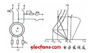 應(yīng)當(dāng)指出,上述兩種反接制動,雖然電動機軸上都有機械功率輸入,但有所不同。在轉(zhuǎn)速反向的反接制動時,這部分機械功率由位能性負(fù)載提供;而定子兩相反接制動,則是整個轉(zhuǎn)動部分所儲存的動能提供。因此,前者可恒速運轉(zhuǎn),后者只能減速,因為儲存的動能隨轉(zhuǎn)速的降低而減小,以致不能保持恒速運轉(zhuǎn)。