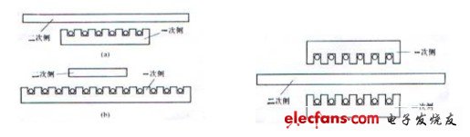 圖4—15所示演變而來的直線感應(yīng)電動(dòng)機(jī),其一次側(cè)和二次側(cè)長度是相等的。由于在運(yùn)行時(shí)一次側(cè)與二次側(cè)之間要做相對運(yùn)動(dòng),假定在運(yùn)動(dòng)開始時(shí),一次側(cè)和二次側(cè)正好對齊,那么在運(yùn)動(dòng)過程中,一次側(cè)和二次側(cè)之間相互電磁耦合的部分就越來越少,影響正常的運(yùn)行。為了保證在所需的行程范圍內(nèi),一次側(cè)和二次側(cè)之間的電磁耦合始終不變,實(shí)際應(yīng)用時(shí),必須把一次側(cè)和二次側(cè)制造成不同長度。當(dāng)然既可以是一次側(cè)短、二次側(cè)長,也可以是一次側(cè)長、二次側(cè)短。前者稱為短一次側(cè),后者稱為長一次側(cè)。如圖4—16所示。由于短一次側(cè)結(jié)構(gòu)比較簡單,制造成本和運(yùn)行費(fèi)用均較低,一般均采用短一次側(cè)。