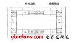 任何一種永磁式直線直流電動(dòng)機(jī),只要把永久磁鐵改成電磁鐵,就成為電磁式直線直流電動(dòng)機(jī),同樣也有動(dòng)圈型和動(dòng)鐵型兩種。圖4—22所示為電磁式動(dòng)圈型直線直流電動(dòng)機(jī)的結(jié)構(gòu)示意圖。當(dāng)勵(lì)磁繞組通電后產(chǎn)生磁通與移動(dòng)繞組的通電導(dǎo)體相互作用產(chǎn)生電磁力,克服滑軌上的靜摩擦力,移動(dòng)繞組便作直線運(yùn)動(dòng)。