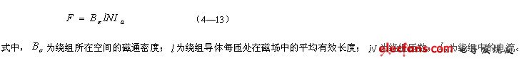 永磁式直線直流電動(dòng)機(jī)的磁極由永久磁鐵做成。按照它的結(jié)構(gòu)特征可分為動(dòng)圈型和動(dòng)鐵型兩種。動(dòng)圈型在實(shí)際中用得較多,如圖4—21所示,在軟鐵架兩端裝有極性同向的兩塊永久磁鐵,當(dāng)移動(dòng)繞組中通入直流電流時(shí),便產(chǎn)生電磁力,只要電磁力大于滑軌上的靜摩擦阻力,繞組就沿著滑軌作直線運(yùn)動(dòng),其運(yùn)動(dòng)的方向可由左手定則確定。改變繞組中直流電流的大小和方向,即可改變電磁力的大小和方向。電磁力的大小為