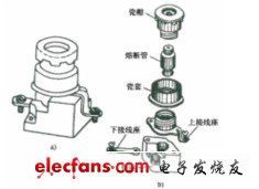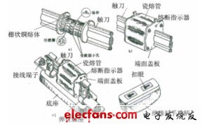 熔斷器一般由熔斷體和底座組成。熔斷體主要包括熔體、填料(有的沒有填料)、熔管、觸刀、蓋板、熔斷指示器等部件。熔斷器結(jié)構(gòu)圖如圖5—10所示。