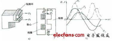 交流接觸器在運行過程中,線圈中通入的交流電在鐵芯中產(chǎn)生交變的磁通,因此鐵芯與銜鐵間的吸力也是變化的。這會使銜鐵產(chǎn)生振動,發(fā)出噪聲。為消除這一現(xiàn)象,在交流接觸器鐵芯和銜鐵的兩個不同端部各開一個槽,槽內(nèi)嵌裝一個用銅、康銅或鎳鉻合金材料制成的短路環(huán),又稱減振環(huán)或分磁環(huán),如圖5—27a所示。鐵芯裝短路環(huán)后,當線圈通以交流電時,線圈電流產(chǎn)生磁通Φ1,Φ1一部分穿過短路環(huán),在環(huán)中產(chǎn)生感生電流,進而會產(chǎn)生一個磁通Φ2,由電磁感應定律知,Φ1和Φ2的相位不同,即Φ1和Φ2不同時為零,則由Φ1和Φ2產(chǎn)生的電磁吸力Fl和F2不同時為零,如圖5—27b所示。這就保證了鐵芯與銜鐵在任何時刻都有吸力,銜鐵將始終被吸住,振動和噪聲會顯著減小。