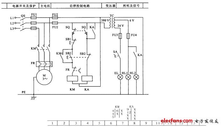 (6)在原理圖上將圖分成若干個(gè)圖區(qū),并標(biāo)明該區(qū)電路的用途和作用。在繼電器、接觸器線圈下方列出觸點(diǎn)表,說(shuō)明線圈和觸點(diǎn)的從屬關(guān)系。