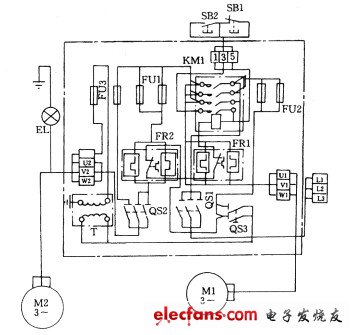 (3)采用電器元件展開(kāi)圖的畫(huà)法。同一電器元件的各部分可以不畫(huà)在一起,但需用同一文字符號(hào)標(biāo)出。若有多個(gè)同一種類的電器元件,可在文字符號(hào)后加上數(shù)字序號(hào),例如KM1、KM2。
