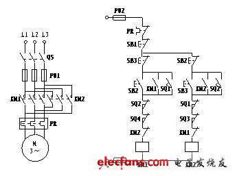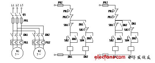 從幾個(gè)電路圖可歸納出實(shí)現(xiàn)順序起動(dòng)的方法是:將控制前一臺(tái)電動(dòng)機(jī)的接觸器的動(dòng)合輔助觸點(diǎn)串聯(lián)在控制后一臺(tái)電動(dòng)機(jī)的接觸器線圈支路中。實(shí)現(xiàn)正序起動(dòng)、逆序停止的方法是:將控制后一臺(tái)電動(dòng)機(jī)的接觸器動(dòng)合輔助觸點(diǎn)與前一臺(tái)電動(dòng)機(jī)的停止按鈕并聯(lián)。