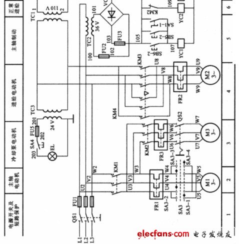 照明燈EL由照明變壓器TC3提供24V的工作電壓,SA4為燈開(kāi)關(guān),F(xiàn)U5提供短路保護(hù)。