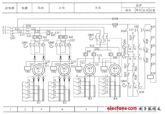 10t交流橋式起重機電氣控制的全電路如圖8-10所示。10t橋式起重機只有一個吊鉤,但大車采用分別驅(qū)動,所以共用了四臺繞線轉(zhuǎn)子異步電動機拖動。起重電動機M1、小車驅(qū)動電動機M2、大車驅(qū)動電動機M3和M4;分別由三只凸輪控制器控制:QM1控制M1、QM2控制M2、QM3同步控制M3與M4;R1~R4分別為四臺電動機轉(zhuǎn)子電路串入的調(diào)速電阻器;YB1~YB4則分別為四臺電動機的制動電磁鐵。三相電源由QS1引入,并由接觸器KM控制。過流繼電器KI0~KI4提供過電流保護,其中KI1~KI4為雙線圈式,分別保護M1、M2、M3與M4;KI0為單線圈式,單獨串聯(lián)在主電路的一相電源線中,作總電路的過電流保護。