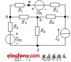為了敘述問題方便,在具體討論基爾霍夫定律之前,首先以圖1.32為例,介紹電路模型圖中的一些常用術(shù)語。