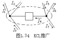 KCL定律不僅適用于電路中的節(jié)點(diǎn),還可以推廣應(yīng)用于電路中的任一假設(shè)的封閉面。即在任一瞬間,通過電路中的任一假設(shè)的封閉面的電流的代數(shù)和為零。
