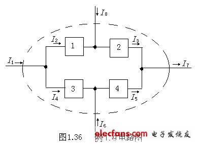 例1.8 已知I1=3A、I2=5A、I3=-18A、I5=9A,計(jì)算圖1.35所示電路中的電流I6及I4。