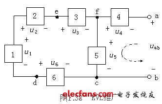 例如,圖1.38所示為某電路中的一部分,路徑a、f、c、b并未構(gòu)成回路,選定圖中所示的回路“繞行方向”,對假象的回路afcba列寫KVL方程有: