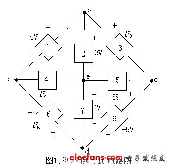 平面電路中,如果回路內(nèi)部不包含其它任何支路,這樣的回路稱為網(wǎng)孔。因此,網(wǎng)孔一定是回路,但回路不一定是網(wǎng)孔。如圖1.32中的回路aecba、abda、bcdb都是網(wǎng)孔,其余的回路則不是網(wǎng)孔。