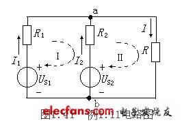 例1.11 圖1.41電路中,Us1=130V、Us2=117V、R1=1Ω、R2=0.6Ω、R=24Ω,試用支路法求各支路電流。