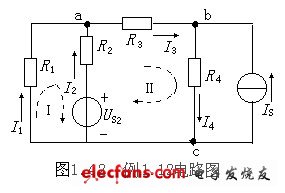 為了敘述方便,首先以一個(gè)具體的例子,介紹支路電流法分析電路的全過程。