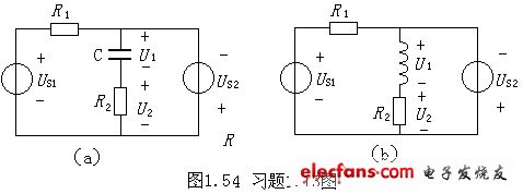 1.13如圖1.54所示電路,已知電壓US1=10V,US2=5V,電阻R1=5Ω,R2=10Ω,電容C=0.1F,電感L=0.1H,求電壓U1、U2。