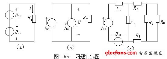 1.14如圖1.55所示電路,已知電壓US1=20V,US2=US3=10V,電流IS1=3A,IS2=1A,IS3=4A,電阻R1=R2=10Ω,R3=20Ω,R4=3Ω,R5=6Ω,R6=1Ω,R7=R8=4Ω,求:
