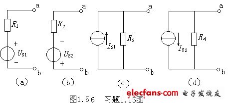 1.15如圖1.56所示電路,已知電壓US1=10V,US2=4V,電流IS1=5A,IS2=2A,電阻R1=R4=5Ω,R2=R3=2Ω,試將電壓源等效變換為電流源;電流源等效變換為電壓源。