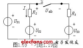 1.19如圖1.59所示電路,已知電壓US1=8V,US2=4V,US3=3V,電阻R2=2Ω,R3=5Ω,(1)當(dāng)開關(guān)K斷開時(shí),求a、b兩端的開路電壓Uab及電流I。(2)當(dāng)開關(guān)S閉合時(shí),電流I是否變化,為什么?