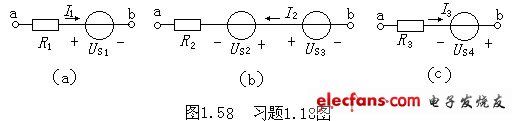 1.18如圖1.58所示電路,已知電壓US1=4V,US2=2V,US3=-6V,US4=-2V,電流I1=2A,I2=1A,I3=-1A,電阻R1=2Ω,R2=4Ω,R3=5Ω,求各段電路的電壓Uab。