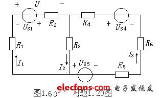 1.20如圖1.60所示電路,已知電壓US1=2V,US4=20V,US5=6V,電阻R1=R2=5Ω,R3=24Ω,R4=20Ω,R5=10Ω,R6=30Ω,求各支路電流I1、I2、I3及電壓U。