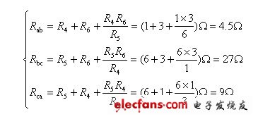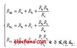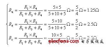 可以證明,將△聯(lián)接的電阻等效變換為Y聯(lián)接的電阻,已知電阻Rab、Rbc、Rca,則等效的電阻Ra、Rb、Rc為:
