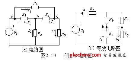 (1)利用公式(2.1),將△聯(lián)接的電阻R1、R3、R4等效變換為Y聯(lián)接的電阻Ra、Rb、Rc,如圖2.10(b)所示,則: