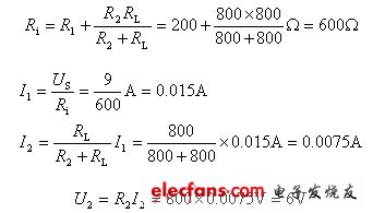 例2.3圖2.7所示的是一個常用的利用滑線變阻器組成的簡單分壓器電路。電阻分壓器的固定端a、b接到直流電壓源上。固定端b與活動端c接到負(fù)載上。利用分壓器上滑動觸頭c的滑動可在負(fù)載電阻上輸出0~U的可變電壓。已知直流理想電壓源電壓US=9V,負(fù)載電阻RL=800Ω,滑線變阻器的總電阻R=1000Ω,滑動觸頭c的位置使R1=200Ω,R2=800Ω。