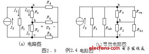 解:利用公式(2.2),將Y聯(lián)接的電阻R4、R5、R6等效變換為△聯(lián)接的電阻Rab、Rbc、Rca,如圖2.9(b)所示,則: