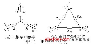 三個電阻的一端連接在一起構(gòu)成一個節(jié)點O,另一端分別為網(wǎng)絡(luò)的三個端鈕a、b、c,它們分別與外電路相連,這種三端網(wǎng)絡(luò)叫電阻的星形聯(lián)接,又叫電阻的Y聯(lián)接。如圖2.8(a)所示。