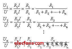 串聯(lián)電阻的電流相等,則各電阻的電壓之比等于它們的電阻之比,即: