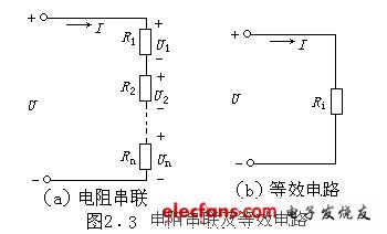 各電阻元件順次連接起來,所構(gòu)成的二端網(wǎng)絡(luò)稱為電阻的串聯(lián)網(wǎng)絡(luò),如圖2.3(a)所示。