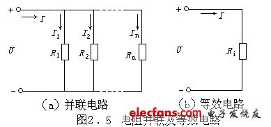 在圖2.5(a)中,根據(jù)KVL定理可知,并聯(lián)的各個電阻的電壓相等,均等于U,則由KCL定理可得:
