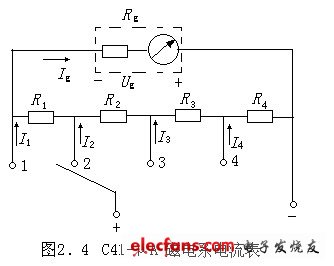 案例2.2 實際用于測量電流的多量程的電流表(例如,C41-μA磁電系電流表)是由表頭與電阻串、并聯(lián)的電路組成,如圖2.4所示。其中,Rg為表頭的內(nèi)阻,Ig為流過表頭的電流,Ug為表頭兩端的電壓,R1、R2、R3、R4為電流表各檔的分流電阻。對應(yīng)一個電阻檔位,電流表有一個量程。