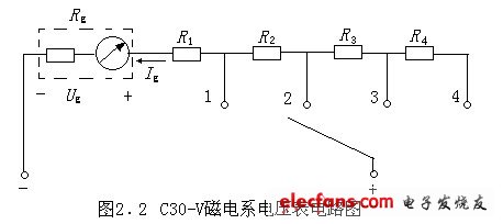 案例2.1 電壓表的表頭所能測量的最大電壓就是其量程,通常它都較小。在測量時,通過表頭的電流是不能超過其量程的,否則將損壞電流表。而實際用于測量電壓的多量程的電壓表(例如,C30-V型磁電系電壓表)是由表頭與電阻串聯(lián)的電路組成,如圖2.2所示。其中,Rg為表頭的內(nèi)阻,Ig為流過表頭的電流,Ug為表頭兩端的電壓,R1、R2、R3、R4為電壓表各檔的分壓電阻。對應(yīng)一個電阻檔位,電壓表有一個量程.