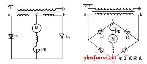 由此可知,在交流電壓的正負兩個半周內(nèi),變壓器二次側(cè)繞組oa、ob交替流過電流而牽引電動機M中則流過連續(xù)不斷的方向不變的電流,從而保證了直流(脈流)牽引電動機正常工作。