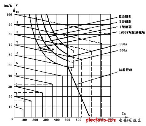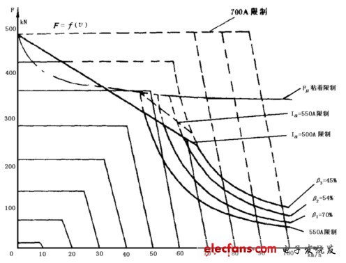 由公式(1-7)可知,機車的牽引力只與牽引電動機電樞電流和電機主極磁通有關(guān),不受牽引電動機端電壓的直接影響,所以整流器電力機車的牽引力特性曲線與直流電力機車牽引力特性曲線相同。